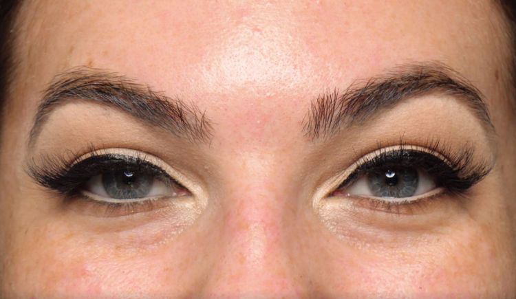 7. Holding the false lashes with tweezers, apply a small amount of lash glue onto the lash band. Let the glue set for 10 seconds, and then apply the lashes just above your upper lash line.