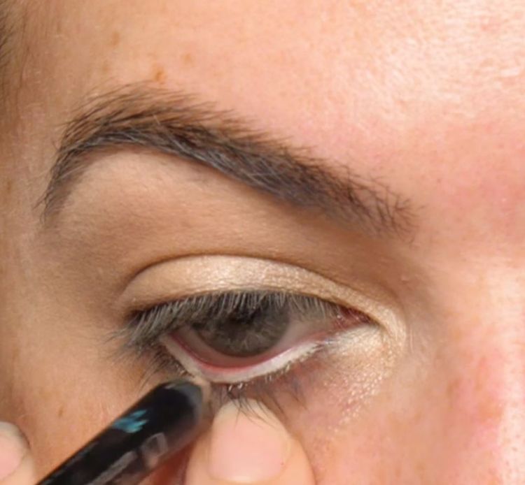 5. Line the lower waterline with peachy-beige pencil eyeliner, and then use the small shadow liner brush to diffuse the pigment at the lash line.