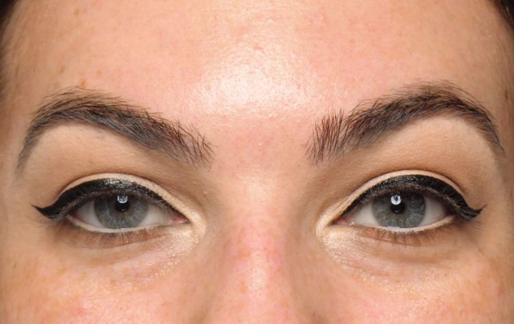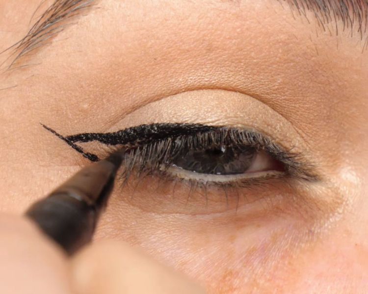 6. Apply black liquid eyeliner just above the upper lashes. Extend the liner slightly beyond the outer corner in a wing.