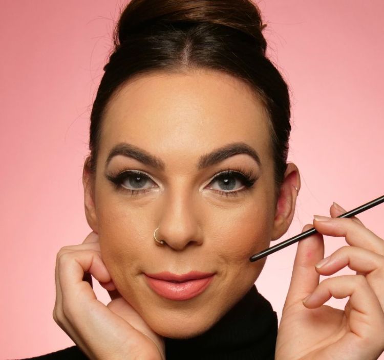 To create her look at home, you’ll need true neutral shades. The eyes are primed, and then a trio of eye shadow is applied. When drawing the eyeliner wing, keep it short. Think kitten, not cat-eye. A full pair of fluffy false lashes give this look its innocent appeal. The cheeks are neutral as well, and coral lipstick rounds out the look.