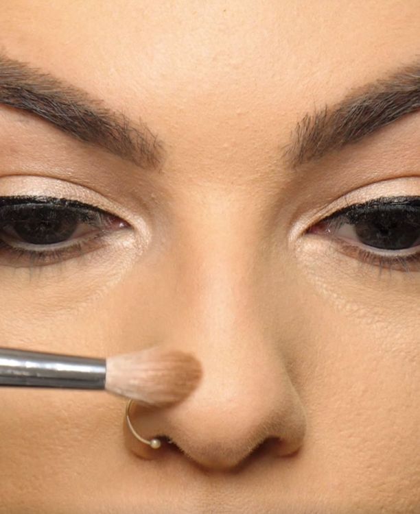 13. Make your nose look slimmer by applying cool brown contouring powder along each side with a narrow brush.