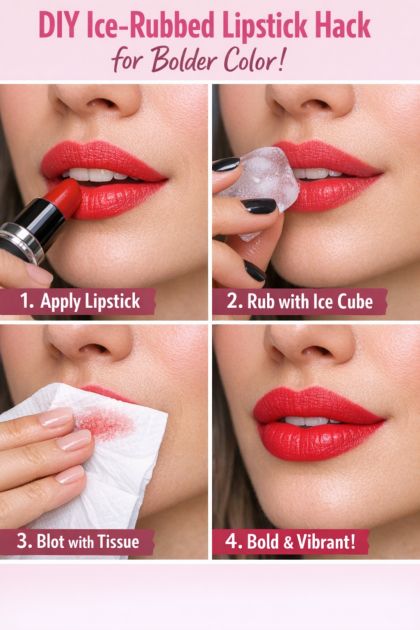 Enhance the vibrancy and longevity of your lipstick with a simple ice cube trick. By applying ice to your lips before lipstick, you can achieve a bolder color payoff, making your lipstick appear more vivid and intense. This DIY beauty hack is perfect for those looking to make their lip color stand out without having to reapply frequently.